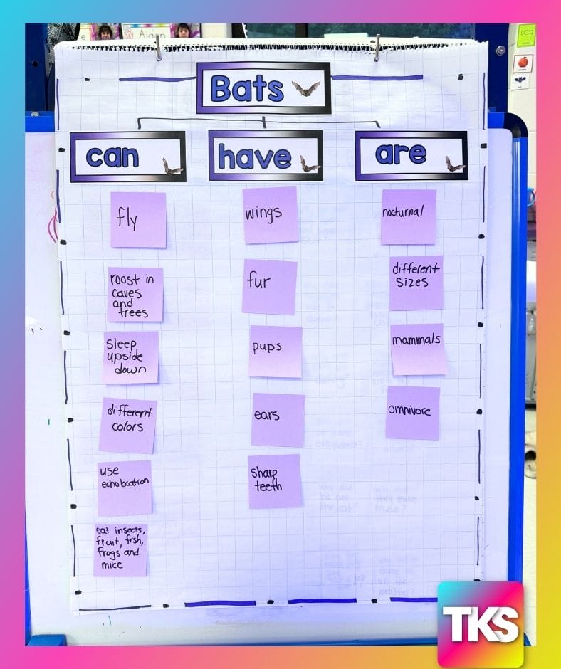 We kick off our bats learning with a schema map. We use Post It Notes so we can move our thoughts around as we organize our learning! As we go through our bats research unit we add learning and move any misconceptions! This is a very visual way for students to organize their learning and it’s very engaging! Using the vocabulary is so necessary!